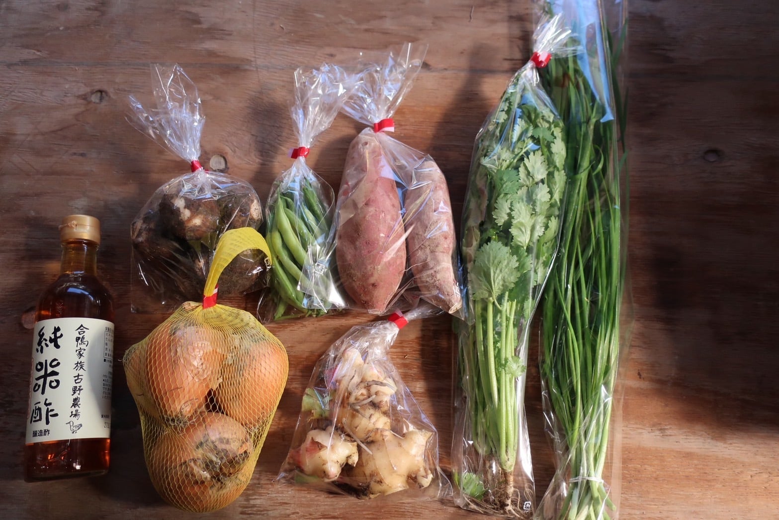 季節の野菜(パクチー、インゲン豆、玉ねぎ、さつま芋、里芋、生姜、ニラ)
