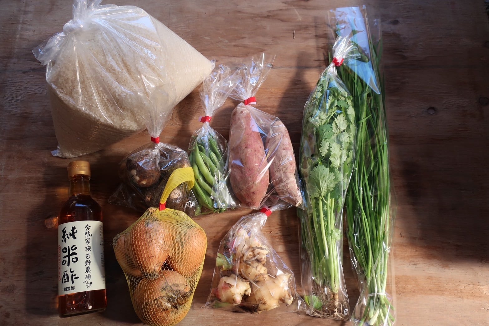 季節の野菜(パクチー、インゲン豆、玉ねぎ、さつま芋、里芋、生姜、ニラ)